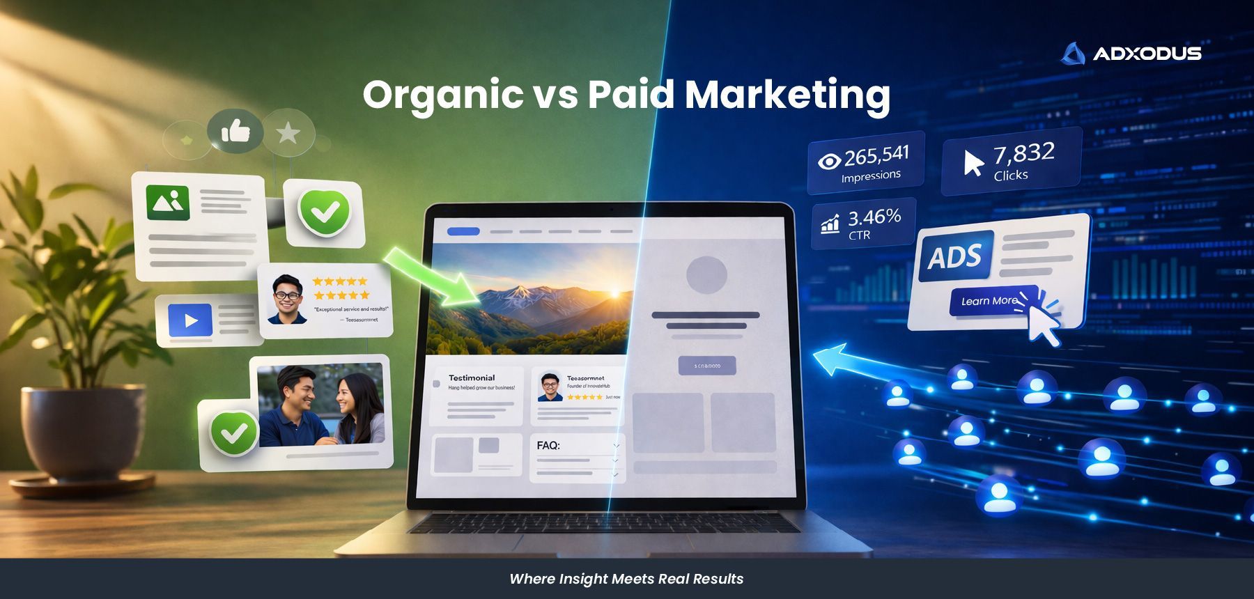 Organic content builds trust and engagement signals. Paid advertising expands reach and accelerates exposure.